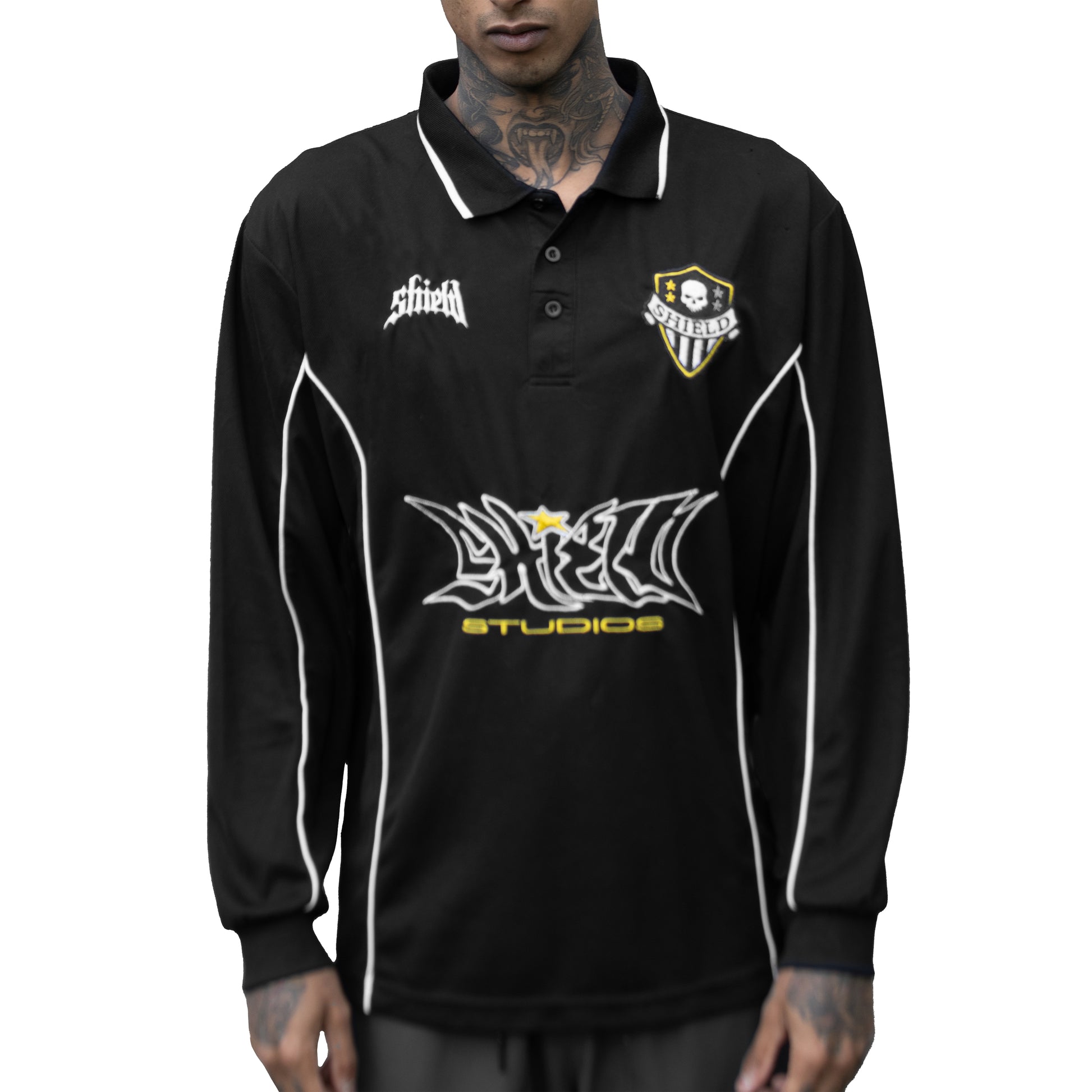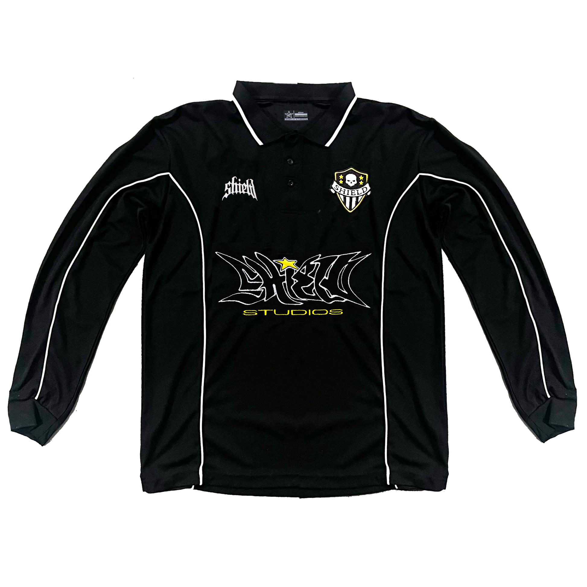 Black 100% polyester, longsleeve multi-embroidered jersey.